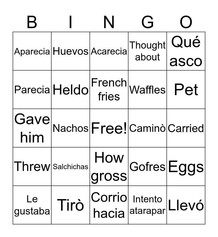 This bingo card has a free space and 29 words: Le gustaba, Totopos y queso, Nachos, Papas Freitas, Aparecia, Acarecia, Heldo, Salchichas, Caminò, Tirò, Carried, Llevó, Corrio hacia, Intento atarapar, Pet, Le dio, How gross, Threw, Qué asco, Gave him, Gofres, Seemed, Waffles, Parecia, Thought about, Huevos, Eggs, French fries and Thought about.