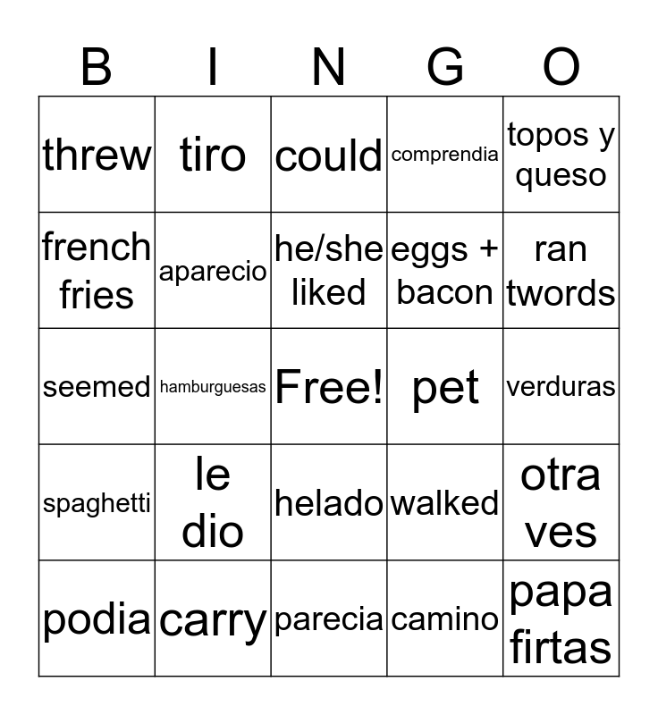 This bingo card has a free space and 29 words: podia, waffle, hamburguesas, llevo, threw, could, aparecio, le dio, pet, carry, verduras, papa firtas, parecia, camino, ran twords, how gross, helado, spaghetti, topos y queso, seemed, walked, gofers, eggs + bacon, french fries, comprendia, tiro, otra ves, he/she liked and pensaba en.