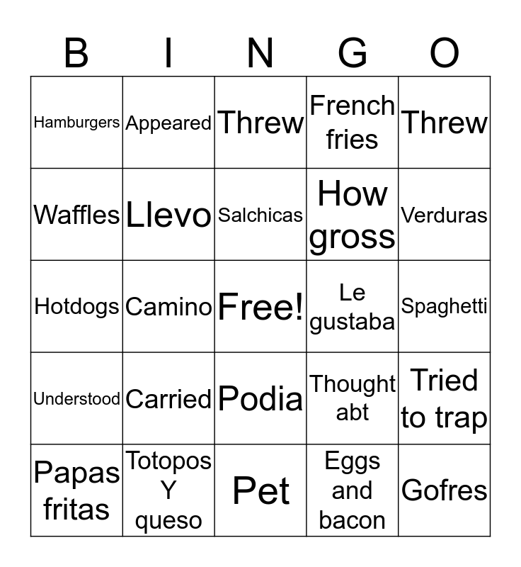 This bingo card has a free space and 29 words: Papas fritas, Otro vez, Camino, Helado, Hamburgers, Threw, Llevo, Carried, Le gustaba, Totopos Y queso, Spaghetti, Gofres, Pet, Eggs and bacon, Verduras, Gave him, Podia, Understood, Threw, Hotdogs, Thought abt, Parecia, How gross, Waffles, French fries, Appeared, Tried to trap, Salchicas and Huevos y tocino.