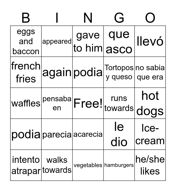 This bingo card has a free space and 27 words: tiro, walks towards, podia, hamburgers, llevó, french fries, appeared, vegetables, runs towards, Ice-cream, podia, again, le dio, he/she likes, waffles, comprendia, gave to him, que asco, hot dogs, eggs and baccon, parecia, acarecia, Tortopos y queso, no sabia que era, intento atrapar, pensaba en and speghetti.