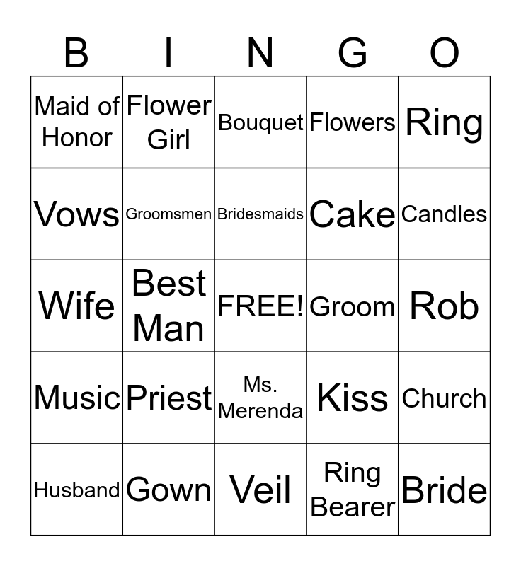 This bingo card has a free space and 24 words: Priest, Gown, Bridesmaids, Husband, Ring, Maid of Honor, Vows, Flower Girl, Groom, Ms. Merenda, Cake, Wife, Kiss, Church, Groomsmen, Ring Bearer, Rob, Bouquet, Candles, Best Man, Bride, Music, Flowers and Veil.