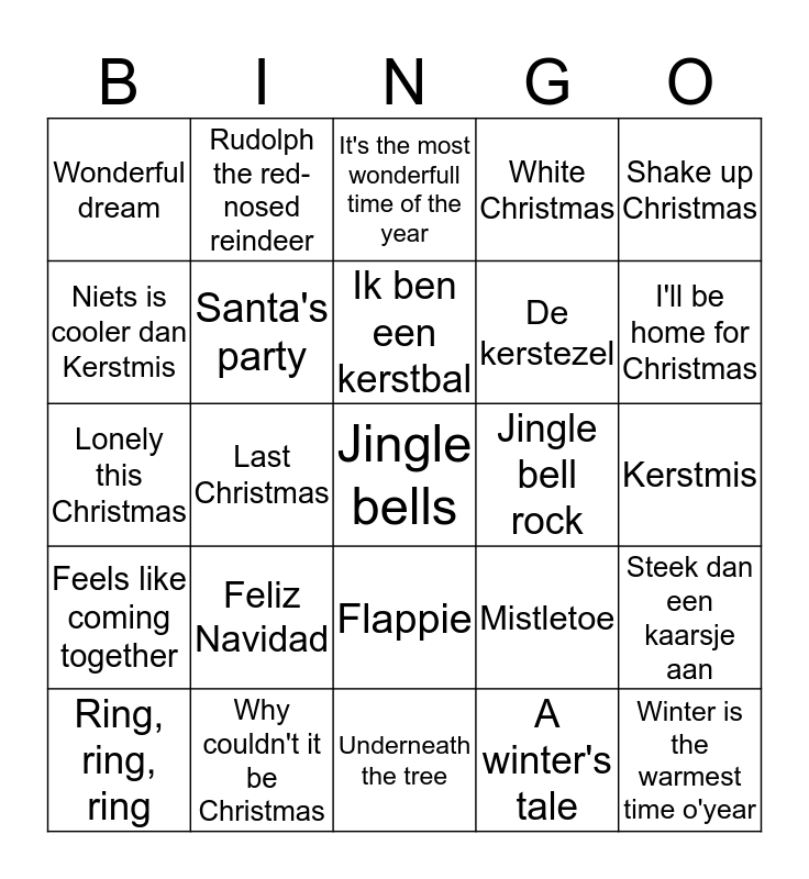 This bingo card has 30 words: Why couldn't it be Christmas, All I want for Christmas is you, Last Christmas, Do they know it's Christmas, Wonderful dream, It's the most wonderfull time of the year, Santa's party, Flappie, Jingle bell rock, Underneath the tree, Kerstmis, Jingle bells, A winter's tale, Winter is the warmest time o'year, I'll be home for Christmas, Christmas lights, Mistletoe, Feels like coming together, Feliz Navidad, Shake up Christmas, Lonely this Christmas, Santa tell me, Rudolph the red-nosed reindeer, De kerstezel, Niets is cooler dan Kerstmis, White Christmas, Steek dan een kaarsje aan, Ring, ring, ring, Ik ben een kerstbal and Happy Christmas.