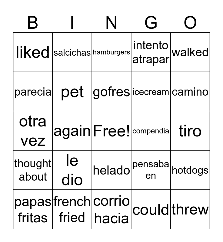 This bingo card has a free space and 29 words: papas fritas, le gustaba, again, carry, liked, hamburgers, pet, le dio, compendia, french fried, tiro, threw, corrio hacia, could, camino, verduras, helado, thought about, walked, otra vez, pensaba en, veggetables, icecream, parecia, intento atrapar, salcichas, hotdogs, gofres and waffles.
