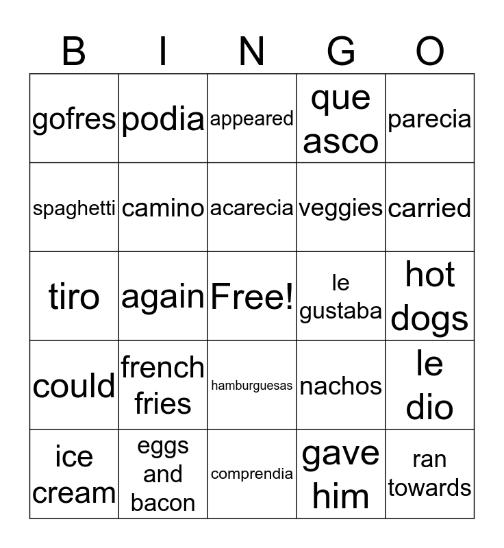 This bingo card has a free space and 29 words: ice cream, pet, again, thought about, gofres, appeared, camino, french fries, le gustaba, eggs and bacon, hot dogs, ran towards, comprendia, gave him, carried, how gross, hamburguesas, could, parecia, tiro, nachos, no sabia, veggies, spaghetti, que asco, podia, le dio, acarecia and otra vez.