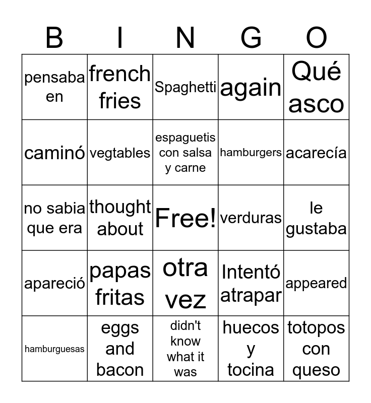 This bingo card has a free space and 24 words: papas fritas, eggs and bacon, espaguetis con salsa y carne, hamburguesas, Qué asco, pensaba en, caminó, french fries, verduras, otra vez, hamburgers, no sabia que era, Intentó atrapar, appeared, vegtables, huecos y tocina, le gustaba, Spaghetti, acarecía, thought about, totopos con queso, apareció, again and didn't know what it was.
