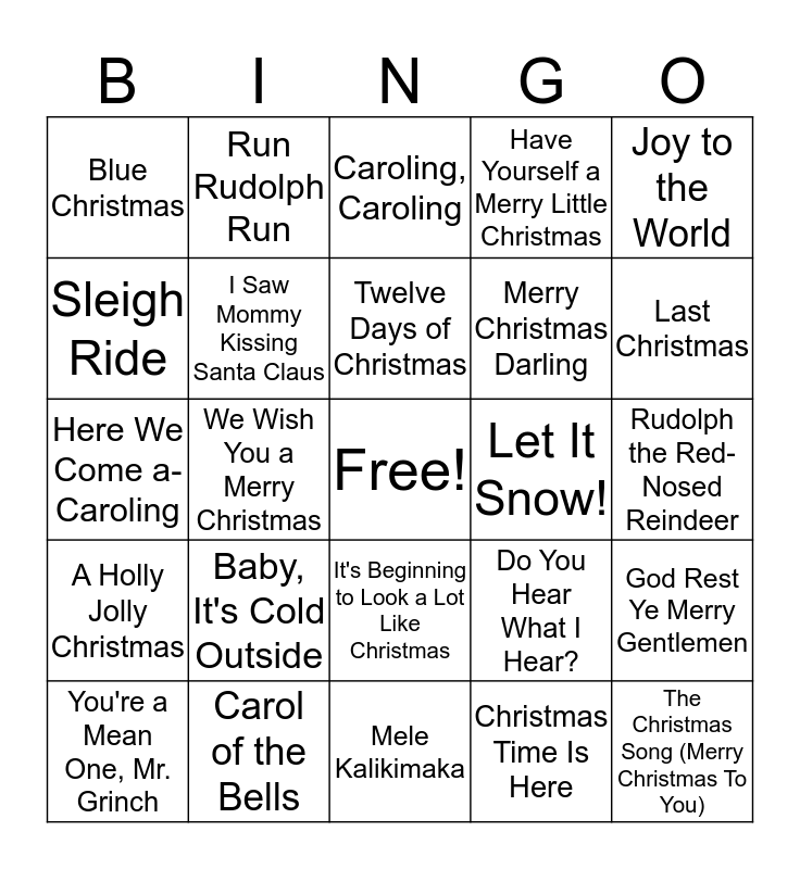 This bingo card has a free space and 54 words: Jingle Bell Rock, A Holly Jolly Christmas, Rockin' Around the Christmas Tree, Winter Wonderland, It's Beginning to Look a Lot Like Christmas, It's the Most Wonderful Time of the Year, Have Yourself a Merry Little Christmas, Christmas (Baby Please Come Home), Sleigh Ride, Santa Baby, Blue Christmas, White Christmas, Carol of the Bells, You're a Mean One, Mr. Grinch, Santa Claus is Coming to Town, Mele Kalikimaka, The Christmas Song (Merry Christmas To You), Merry Christmas Darling, Silver Bells, Rudolph the Red-Nosed Reindeer, Do You Hear What I Hear?, Here Comes Santa Claus, Let It Snow!, Joy to the World, The First Noel, Run Rudolph Run, Feliz Navidad, The Little Drummer Boy, Frosty the Snowman, Christmas Time Is Here, Mistletoe and Holly, Happy Xmas (War is Over), Silent Night, (Everybody's Waitin' For) The Man with the Bag, Caroling, Caroling, Do They Know It's Christmas?, Here We Come a-Caroling, God Rest Ye Merry Gentlemen, All I Want for Christmas (Is My Two Front Teeth), I Saw Mommy Kissing Santa Claus, This Christmas, O Christmas Tree, I'll Be Home for Christmas, What Child Is This?, Baby, It's Cold Outside, Wonderful Christmastime, Little Saint Nick, O Little Town of Bethlehem, Twelve Days of Christmas, We Wish You a Merry Christmas, Last Christmas, Happy Holiday, Jingle Bells and (There's No Place Like) Home for the Holidays.