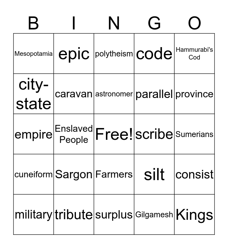 This bingo card has a free space and 27 words: silt, irrigation, parallel, surplus, city-state, polytheism, epic, cuneiform, scribe, consist, empire, code, military, tribute, province, region, caravan, astronomer, Sargon, Mesopotamia, Sumerians, Gilgamesh, Enslaved People, Kings, Farmers, Hammurabi's Cod and complex.