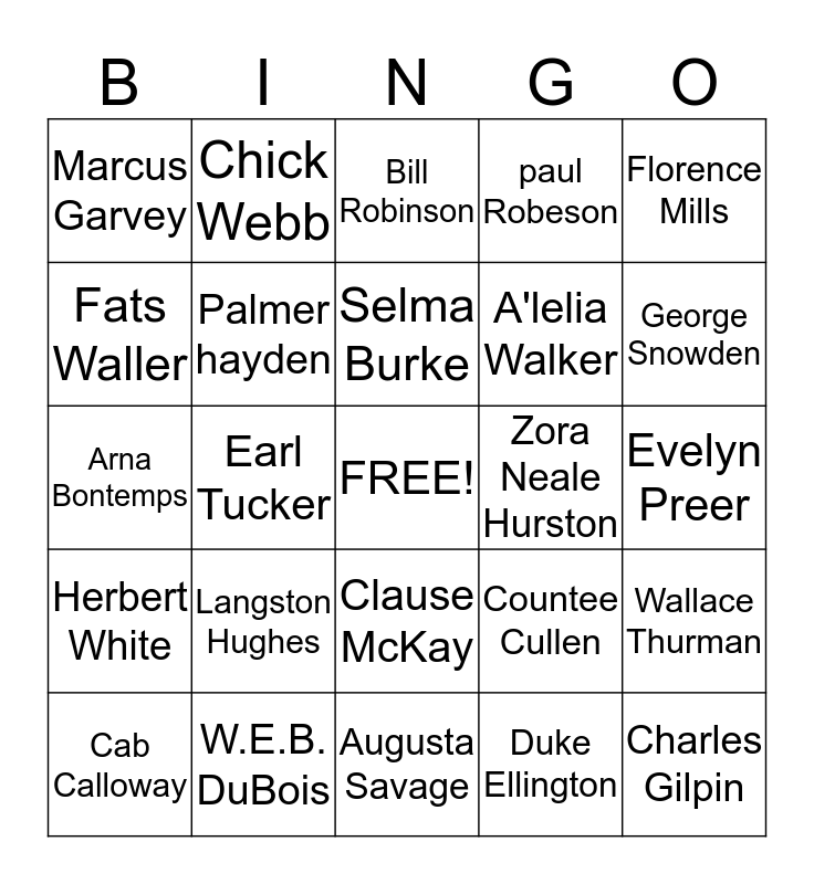 This bingo card has a free space and 24 words: Langston Hughes, W.E.B. DuBois, Selma Burke, Cab Calloway, Florence Mills, Marcus Garvey, Fats Waller, Chick Webb, Zora Neale Hurston, Clause McKay, A'lelia Walker, Arna Bontemps, Countee Cullen, Wallace Thurman, Palmer hayden, Duke Ellington, Evelyn Preer, Bill Robinson, George Snowden, Earl Tucker, Charles Gilpin, Herbert White, paul Robeson and Augusta Savage.