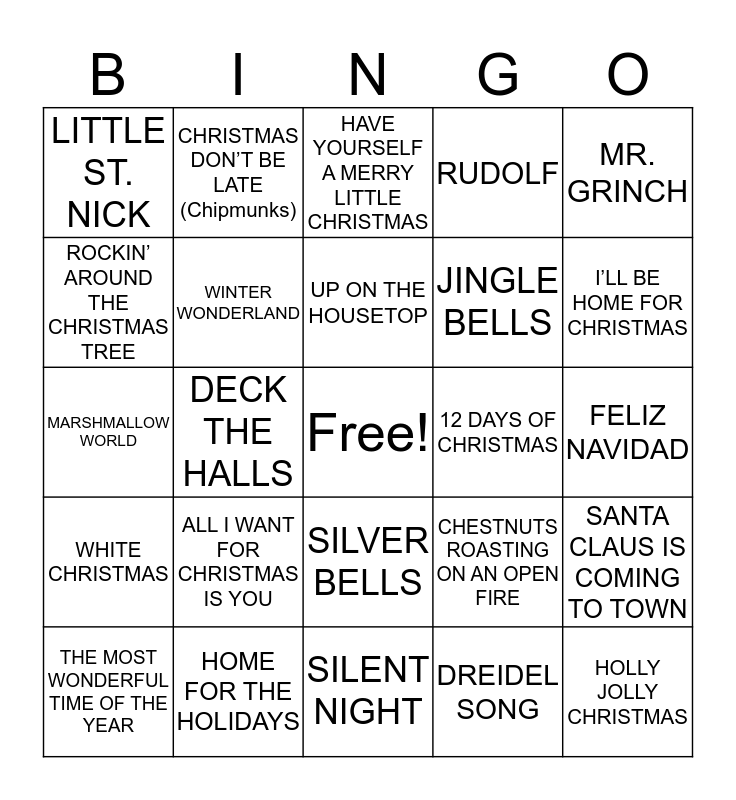 This bingo card has a free space and 30 words: HOME FOR THE HOLIDAYS, GRANDMA GOT RUN OVER BY A REINDEER, DECK THE HALLS, LET IT SNOW, LITTLE ST. NICK, HAVE YOURSELF A MERRY LITTLE CHRISTMAS, WINTER WONDERLAND, SILVER BELLS, 12 DAYS OF CHRISTMAS, SILENT NIGHT, FELIZ NAVIDAD, HOLLY JOLLY CHRISTMAS, DREIDEL SONG, FROSTY THE SNOWMAN, I’LL BE HOME FOR CHRISTMAS, WE WISH YOU A MERRY CHRISTMAS, CHESTNUTS ROASTING ON AN OPEN FIRE, WHITE CHRISTMAS, ALL I WANT FOR CHRISTMAS IS YOU, MR. GRINCH, MARSHMALLOW WORLD, DO YOU HEAR WHAT I HEAR?INGLE BELL ROCK, CHRISTMAS DON’T BE LATE (Chipmunks), JINGLE BELLS, ROCKIN’ AROUND THE CHRISTMAS TREE, RUDOLF, SANTA CLAUS IS COMING TO TOWN, THE MOST WONDERFUL TIME OF THE YEAR, UP ON THE HOUSETOP and CHARLIE BROWN DANCE.