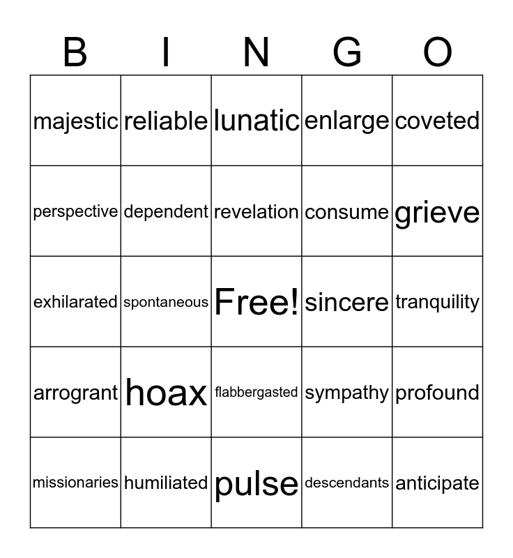 This bingo card has a free space and 34 words: fertile, descendants, plentiful, European, arrogrant, dependent, coveted, missionaries, reliable, grim, revelation, lunatic, acquainted, surreal, sincere, grieve, humiliated, exhilarated, hoax, sympathy, flabbergasted, serene, majestic, tranquility, pulse, anticipate, enlarge, crucial, consume, perspective, decipher, spontaneous, profound and eccentric.