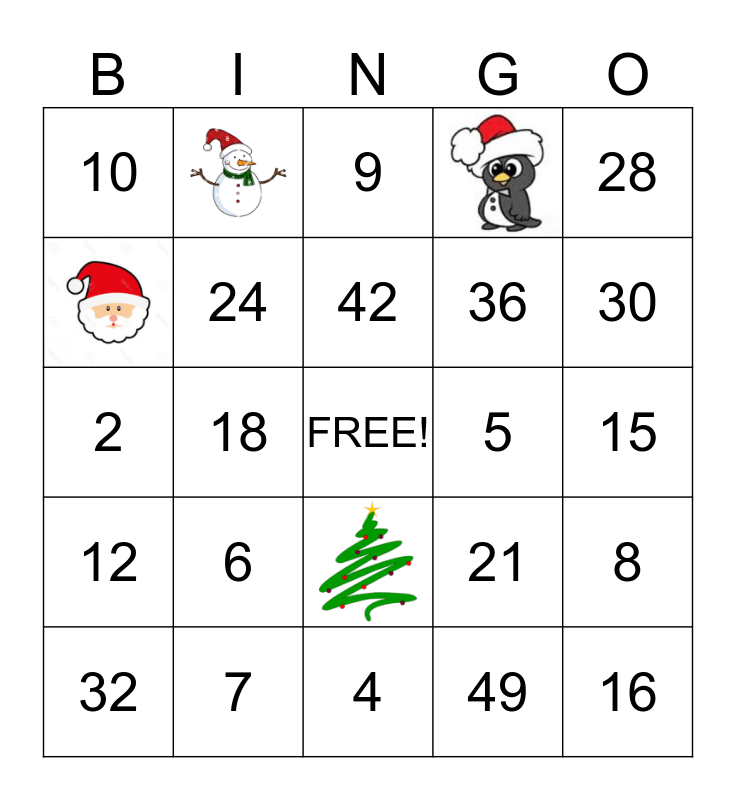 This bingo card has 5 images, a free space and 24 words: 25, 7, 9, 3, 28, 10, 24, 42, 5, 8, 32, 18, 49, 16, 2, 20, 4, 21, 30, 12, 6, 35, 36 and 15.
