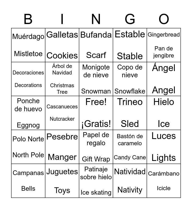 This bingo card has a free space and 34 words: Mitones Mittens, Natividad Nativity, Estrella Star, Reno Reindeer, Polo Norte North Pole, Árbol de Navidad Christmas Tree, Gingerbread Pan de jengibre, Campanas Bells, Galletas Cookies, Nieve Snow, Monigote de nieve Snowman, Bufanda Scarf, Castañas Chestnuts, Duendes Elves, Trineo Sled, Ángel Angel, Juguetes Toys, Ponche de huevo Eggnog, Pesebre Manger, Bastón de caramelo Candy Cane, Papel de regalo Gift Wrap, Gift Regalo, Muérdago Mistletoe, Hielo Ice, Patinaje sobre hielo Ice skating, Carámbano Icicle, Estable Stable, Chocolate caliente Hot chocolate, Copo de nieve Snowflake, Decoraciones Decorations, Ornamento Ornament, Cascanueces Nutcracker, Luces Lights and Esquí Ski.