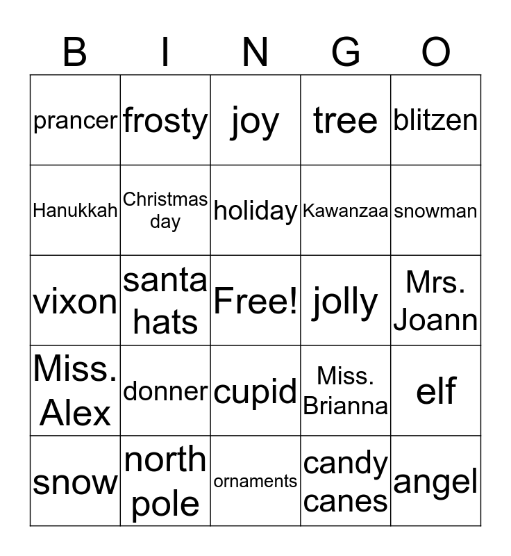 This bingo card has a free space and 44 words: cookies, angel, star, snow, bulbs, candy canes, joy, santa, blitzen, north pole, tree, jolly, cupid, donner, mistletoe, ornaments, rudolph, vixon, donner, snowman, frosty, dasher, dancer, prancer, Mr. Pado, Mrs. Joann, Miss. Vizz, Miss. Mia, Miss. Brianna, Miss. Alex, Mrs. Genny, elf, songs, jingle bells, santa hats, toys, lights, let it snow, holiday, Hanukkah, Kawanzaa, Christmas eve, Christmas day and Mrs. Claus.