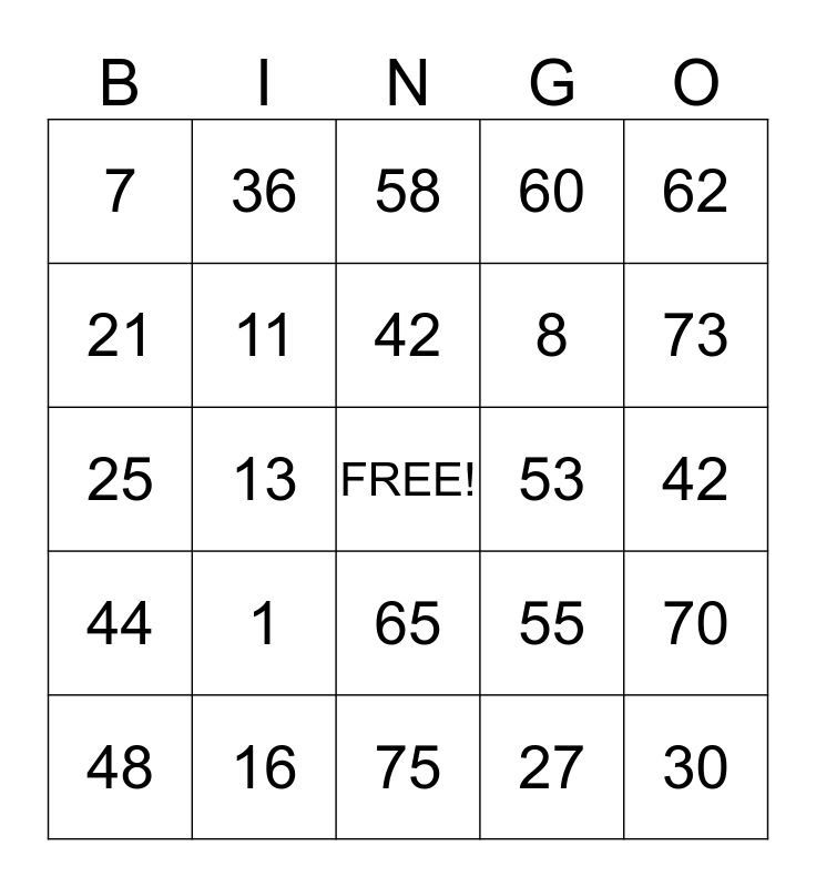 This bingo card has a free space and 24 words: 1, 16, 42, 48, 62, 7, 21, 36, 53, 65, 8, 25, 55, 70, 11, 27, 42, 58, 73, 13, 30, 44, 60 and 75.