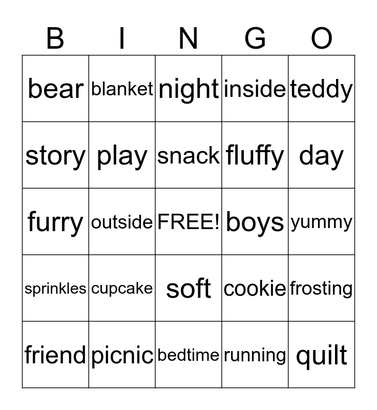 This bingo card has a free space and 24 words: cupcake, picnic, snack, friend, teddy, bear, story, blanket, boys, soft, fluffy, furry, cookie, frosting, play, running, yummy, night, day, outside, quilt, sprinkles, inside and bedtime.