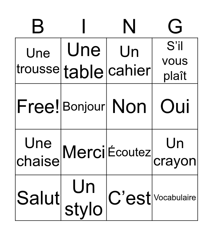 This bingo card has 16 words: Un stylo, Un crayon, Un cahier, Une trousse, Une chaise, Une table, Écoutez, C’est, Free!, Bonjour, Salut, S’il vous plaît, Merci, Oui, Non and Vocabulaire.