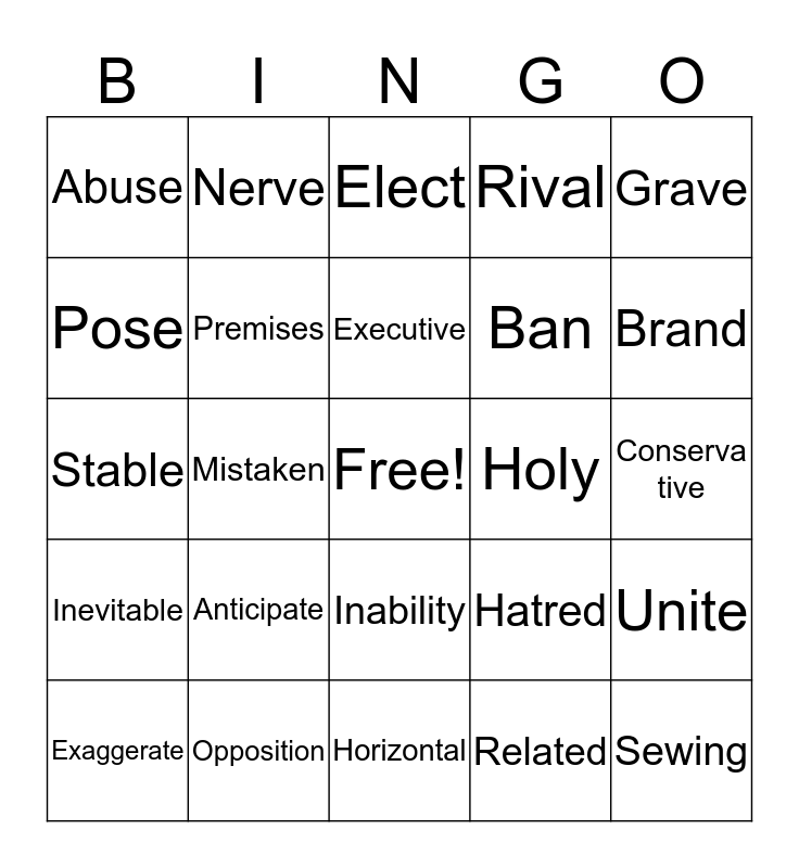 This bingo card has a free space and 24 words: Anticipate, Opposition, Executive, Exaggerate, Grave, Abuse, Pose, Nerve, Holy, Inability, Ban, Stable, Hatred, Unite, Premises, Related, Conserva tive, Elect, Brand, Mistaken, Sewing, Inevitable, Rival and Horizontal.