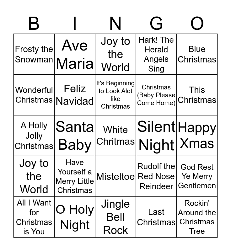This bingo card has 30 words: O Holy Night, Little Drummer Boy, Santa Baby, Thank God it's Christmas, Frosty the Snowman, Joy to the World, Feliz Navidad, Misteltoe, Silent Night, Jingle Bell Rock, Happy Xmas, White Chritmas, Last Christmas, Rockin' Around the Christmas Tree, This Christmas, Sleigh Ride, Rudolf the Red Nose Reindeer, Joy to the World, Have Yourself a Merry Little Christmas, Blue Christmas, A Holly Jolly Christmas, The Christmas Song, Ave Maria, Christmas (Baby Please Come Home), Wonderful Christmas, Hark! The Herald Angels Sing, God Rest Ye Merry Gentlemen, All I Want for Christmas is You, It's Beginning to Look Alot like Christmas and I Saw Mommy Kissing Santa Claus.
