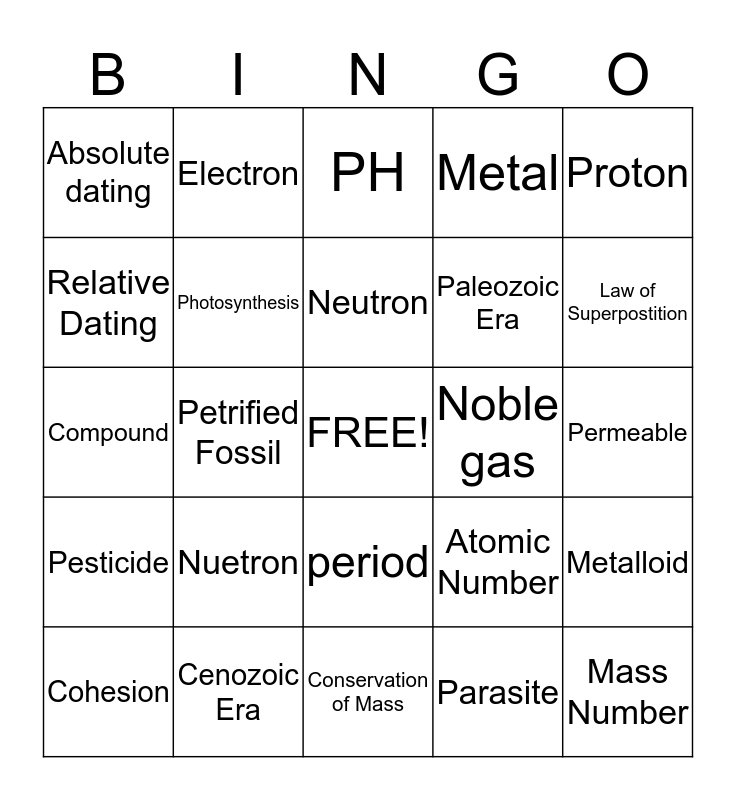 This bingo card has a free space and 24 words: Nuetron, Cenozoic Era, Neutron, Cohesion, Proton, Absolute dating, Relative Dating, Electron, Noble gas, period, Paleozoic Era, Compound, Atomic Number, Metalloid, Photosynthesis, Parasite, Permeable, PH, Law of Superpostition, Petrified Fossil, Mass Number, Pesticide, Metal and Conservation of Mass.