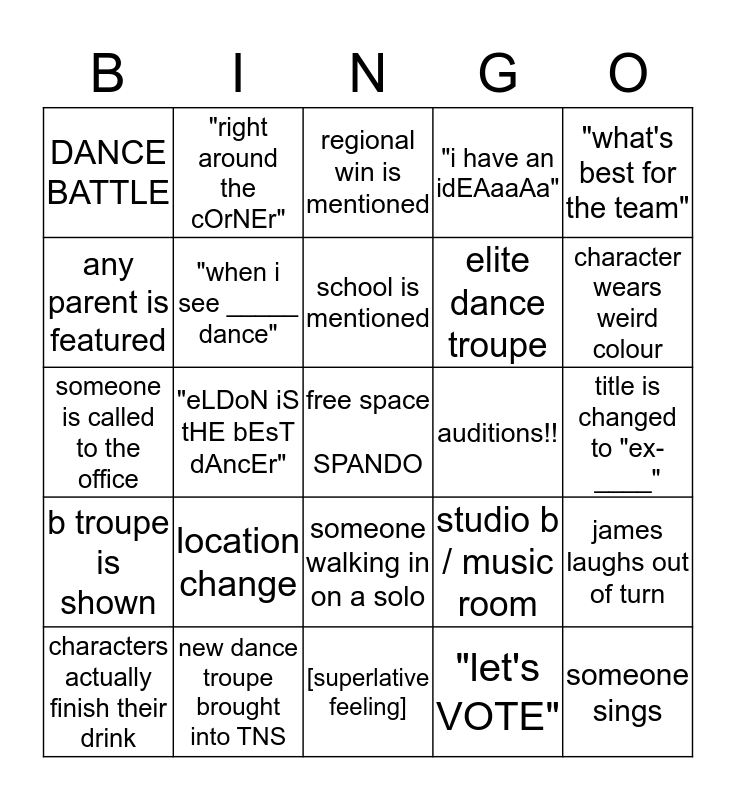 This bingo card has a free space and 24 words: location change, new dance troupe brought into TNS, school is mentioned, characters actually finish their drink, "what's best for the team", DANCE BATTLE, any parent is featured, "right around the cOrNEr", auditions!!, someone walking in on a solo, elite dance troupe, someone is called to the office, studio b / music room, james laughs out of turn, "when i see _____ dance", "let's VOTE", title is changed to "ex-____", regional win is mentioned, character wears weird colour, "eLDoN iS tHE bEsT dAncEr", someone sings, b troupe is shown, "i have an idEAaaAa" and [superlative feeling].