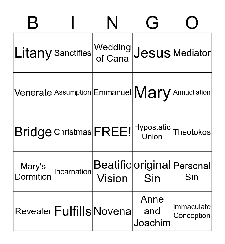 This bingo card has a free space and 24 words: Incarnation, Fulfills, Emmanuel, Revealer, Mediator, Litany, Venerate, Sanctifies, Hypostatic Union, Beatific Vision, Mary, Bridge, original Sin, Personal Sin, Assumption, Anne and Joachim, Theotokos, Wedding of Cana, Annuctiation, Christmas, Immaculate Conception, Mary's Dormition, Jesus and Novena.