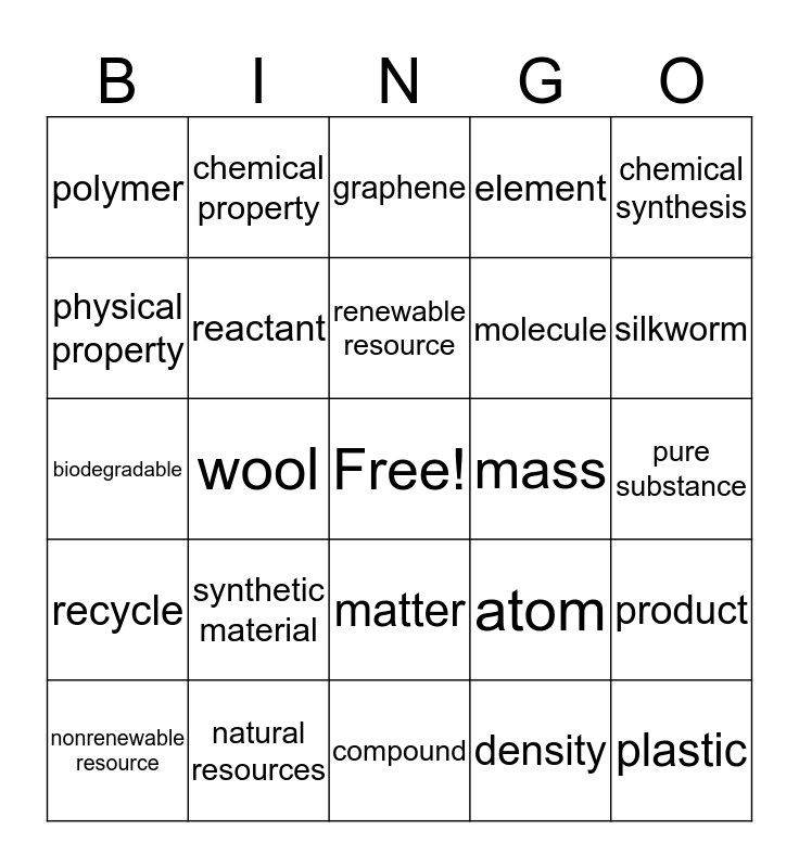 This bingo card has a free space and 24 words: synthetic material, natural resources, renewable resource, nonrenewable resource, chemical synthesis, polymer, physical property, chemical property, mass, matter, molecule, biodegradable, atom, product, reactant, density, pure substance, graphene, silkworm, wool, plastic, recycle, element and compound.