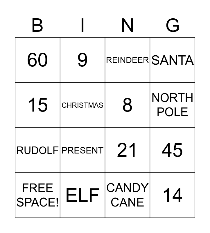 This bingo card has 16 words: ELF, 45, REINDEER, 60, RUDOLF, 9, 21, CANDY CANE, 15, CHRISTMAS, FREE SPACE!, SANTA, PRESENT, NORTH POLE, 8 and 14.
