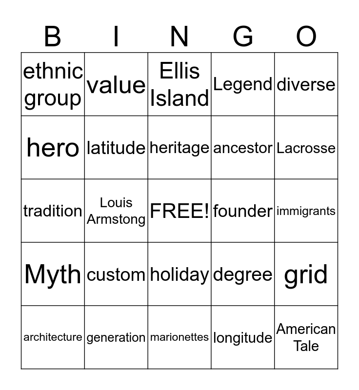 This bingo card has a free space and 24 words: custom, generation, heritage, architecture, diverse, ethnic group, hero, value, founder, holiday, ancestor, tradition, degree, grid, latitude, longitude, immigrants, Ellis Island, Lacrosse, Louis Armstong, American Tale, Myth, Legend and marionettes.