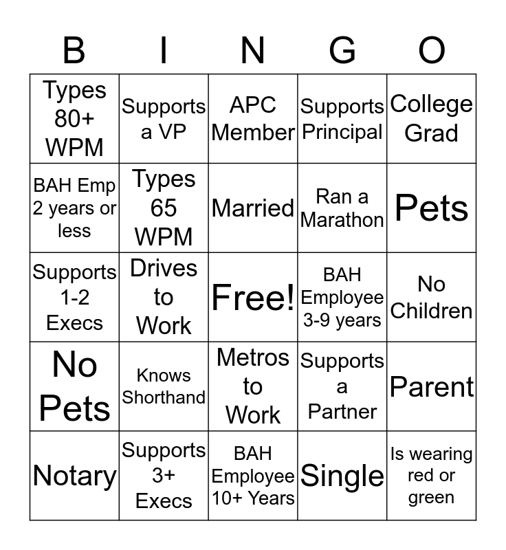 This bingo card has a free space and 24 words: Notary, Knows Shorthand, Married, Single, College Grad, Types 80+ WPM, Supports a VP, APC Member, BAH Employee 3-9 years, No Children, Supports 1-2 Execs, Types 65 WPM, Supports a Partner, Parent, BAH Emp 2 years or less, Supports 3+ Execs, BAH Employee 10+ Years, Supports Principal, Pets, No Pets, Drives to Work, Metros to Work, Ran a Marathon and Is wearing red or green.