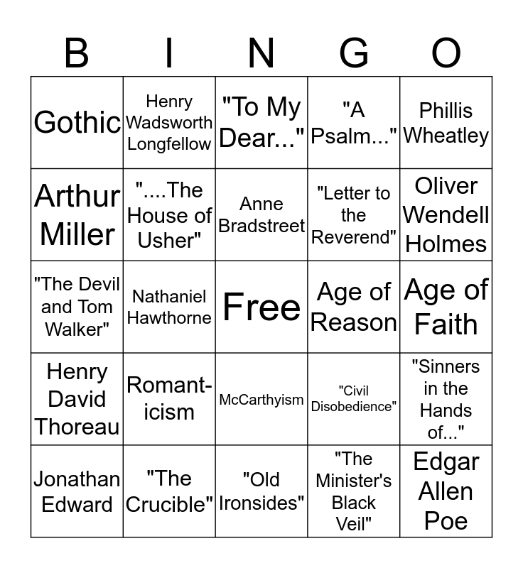 This bingo card has a free space and 24 words: Romant-icism, "The Crucible", Anne Bradstreet, Jonathan Edward, Phillis Wheatley, Gothic, Arthur Miller, Henry Wadsworth Longfellow, Age of Reason, McCarthyism, "Letter to the Reverend", "The Devil and Tom Walker", "Civil Disobedience", "Sinners in the Hands of...", "....The House of Usher", "The Minister's Black Veil", Age of Faith, "To My Dear...", Oliver Wendell Holmes, Nathaniel Hawthorne, Edgar Allen Poe, Henry David Thoreau, "A Psalm..." and "Old Ironsides".