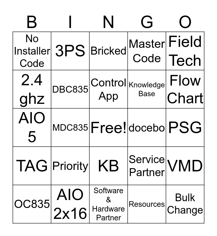 This bingo card has a free space and 33 words: Command Hybrid, Dealer ID 53, MDC835, MobileTech, TAG, DBC835, Field Tech, OC835, 3PS, ADT Canada, Control App, Bricked, FSC, RC8326, docebo, Flow Chart, AIO 2x16, AIO 5, Priority, Service Partner, KB, Command AIO, No Installer Code, PSG, Software & Hardware Partner, Bulk Change, Master Code, Knowledge Base, 2.4 ghz, VMD, Misdirected Call, Resources and Partner Portal.