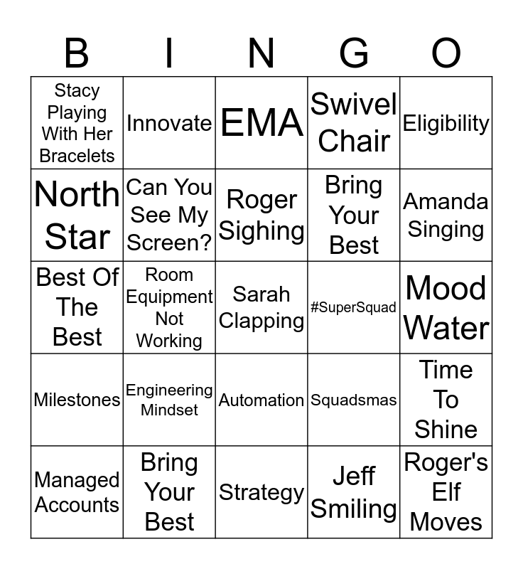 This bingo card has a free space and 27 words: Squadsmas, Time To Shine, Bring Your Best, Strategy, North Star, EMA, Innovate, Milestones, #SuperSquad, Time To Shine, Best Of The Best, Swivel Chair, Managed Accounts, Bring Your Best, Amanda Singing, Integrating IRT, Can You See My Screen?, Roger Sighing, Engineering Mindset, Stacy Playing With Her Bracelets, Mood Water, Jeff Smiling, Room Equipment Not Working, Roger's Elf Moves, Automation, Eligibility and Hard Dates.
