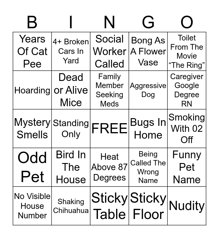This bingo card has a free space and 24 words: Bird In The House, Shaking Chihuahua, Family Member Seeking Meds, No Visible House Number, Toilet From The Movie “The Ring”, Years Of Cat Pee, Hoarding, 4+ Broken Cars In Yard, Bugs In Home, Heat Above 87 Degrees, Aggressive Dog, Mystery Smells, Being Called The Wrong Name, Funny Pet Name, Dead or Alive Mice, Sticky Floor, Smoking With 02 Off, Social Worker Called, Caregiver Google Degree RN, Standing Only, Nudity, Odd Pet, Bong As A Flower Vase and Sticky Table.