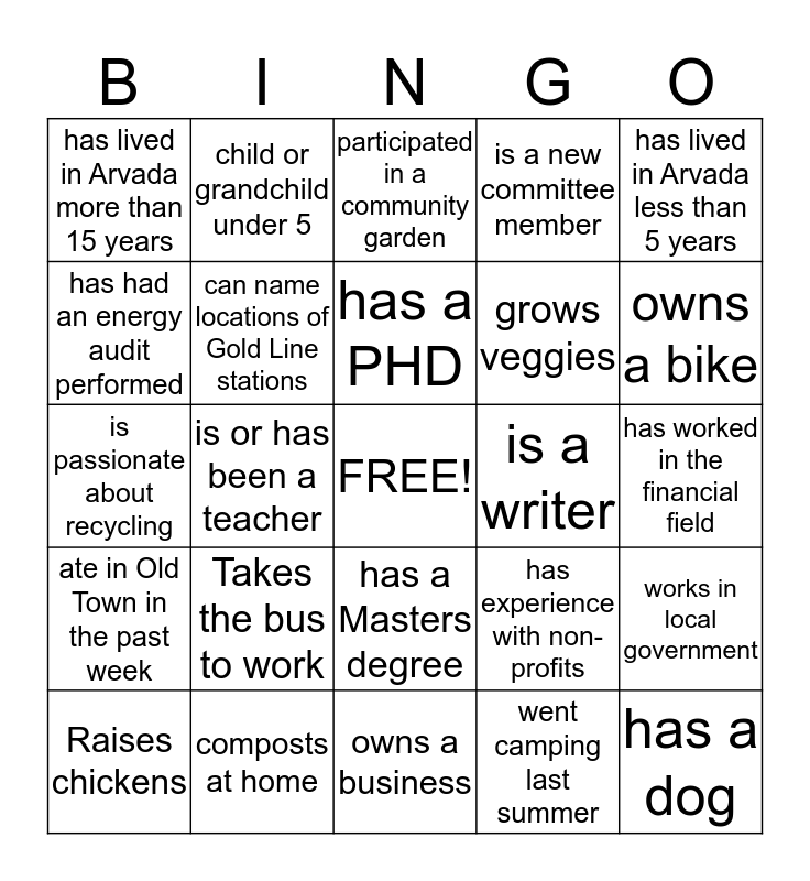 This bingo card has a free space and 24 words: Takes the bus to work, composts at home, has a PHD, Raises chickens, has lived in Arvada less than 5 years, has lived in Arvada more than 15 years, has had an energy audit performed, child or grandchild under 5, is a writer, has a Masters degree, grows veggies, is passionate about recycling, has experience with non-profits, works in local government, can name locations of Gold Line stations, went camping last summer, has worked in the financial field, participated in a community garden, owns a bike, is or has been a teacher, has a dog, ate in Old Town in the past week, is a new committee member and owns a business.