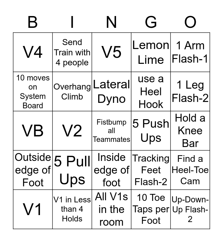 This bingo card has a free space and 29 words: V1, V0, V2, V3, V4, V5, Overhang Climb, 5 Pull Ups, 5 Push Ups, V1 in Less than 4 Holds, Hold a Knee Bar, Up-Down-Up Flash-2, All V1s in the room, 10 Toe Taps per Foot, 1 Leg Flash-2, T-Rex Climb V1, Inside edge of foot, Outside edge of Foot, 1 Arm Flash-1, VB, Tracking Feet Flash-2, Make up a climb, use a Heel Hook, 10 moves on System Board, Lemon Lime, Send Train with 4 people, Find a Heel-Toe Cam, Lateral Dyno and Tell Coaches a good Joke.