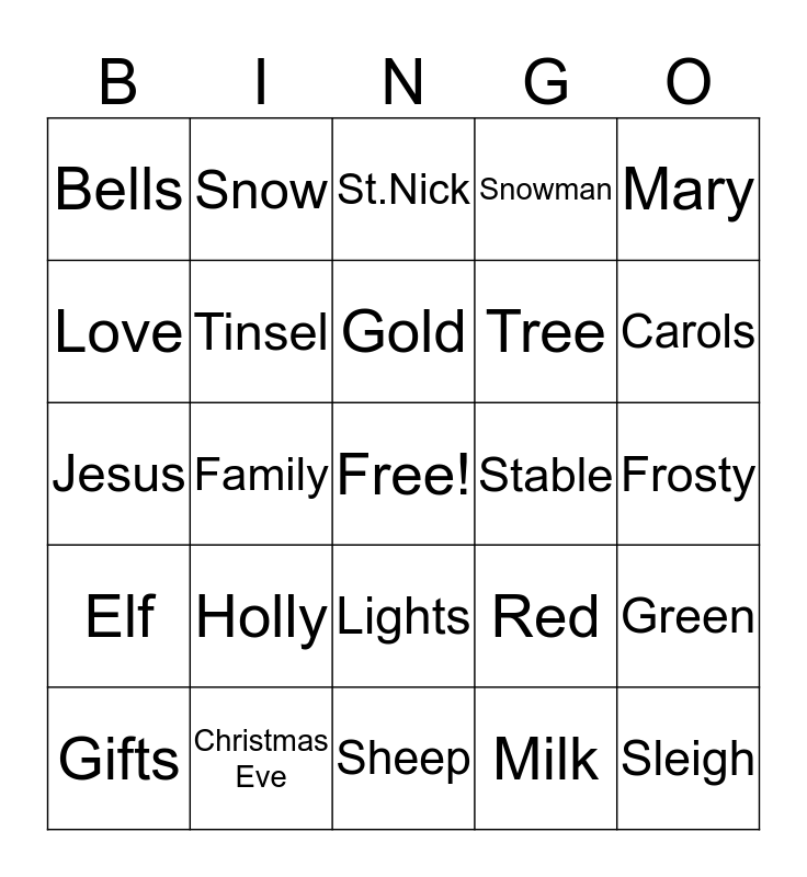 This bingo card has a free space and 24 words: Holly, Christmas Eve, Gold, Gifts, Mary, Bells, Love, Snow, Stable, Lights, Tree, Jesus, Red, Green, Tinsel, Milk, Frosty, St.Nick, Carols, Family, Sleigh, Elf, Snowman and Sheep.