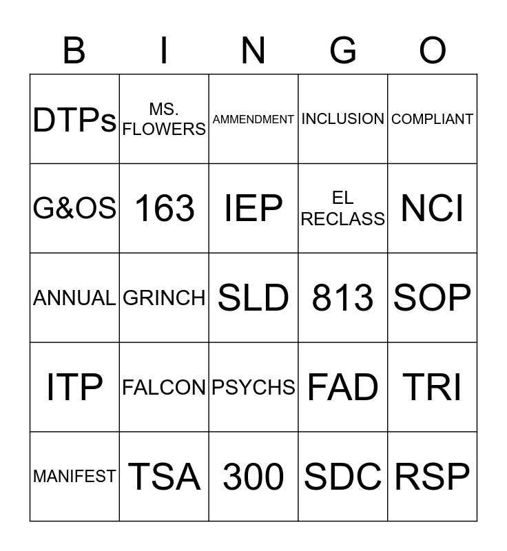 This bingo card has a free space and 24 words: FALCON, TSA, IEP, MANIFEST, COMPLIANT, DTPs, G&OS, MS. FLOWERS, 813, PSYCHS, EL RECLASS, ANNUAL, FAD, TRI, 163, SDC, SOP, AMMENDMENT, NCI, GRINCH, RSP, ITP, INCLUSION and 300.