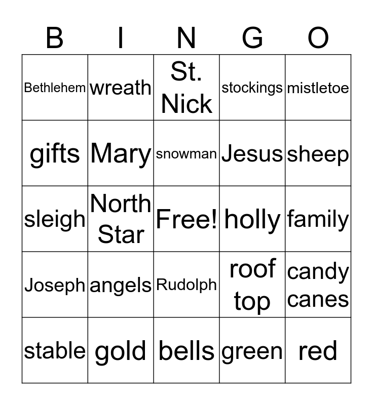 This bingo card has a free space and 24 words: angels, gold, snowman, stable, mistletoe, Bethlehem, gifts, wreath, holly, Rudolph, Jesus, sleigh, roof top, candy canes, Mary, green, family, St. Nick, sheep, North Star, red, Joseph, stockings and bells.