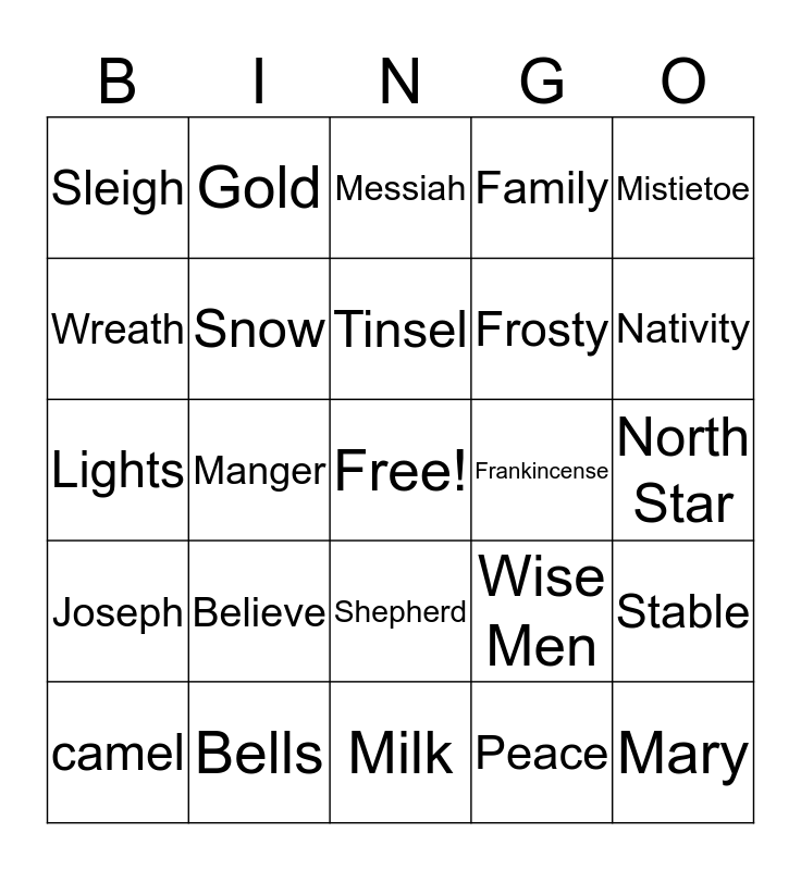 This bingo card has a free space and 24 words: Believe, Bells, Tinsel, camel, Mistietoe, Sleigh, Wreath, Gold, Frankincense, Shepherd, Frosty, Lights, Wise Men, Stable, Snow, Peace, North Star, Messiah, Nativity, Manger, Mary, Joseph, Family and Milk.
