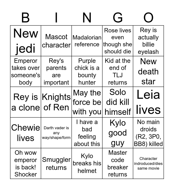 This bingo card has a free space and 29 words: Oh wow emperor is back! Shocker, Luke force ghost, Knights of Ren, Lando takew ship back, New jedi, Madalorian reference, Rey's parents are important, Darth vader is any way/shape/form, Solo did kill himself, Smuggler returns, Leia lives, Character indroduced/dies same movie, Kylo breaks his helmet, Master code breaker returns, New death star, Rey dies, I have a bad feeling about this, Chewie lives, Rey is actually billie eyelash, Rey is a clone, Kylo good guy, New force power, Kid at the end of TLJ returns, Emperor takes over someone's body, Rose lives even though she should die, Mascot character, No main droids (R2, 3P0, BB8) killed, Purple chick is a bounty hunter and The movie is good.