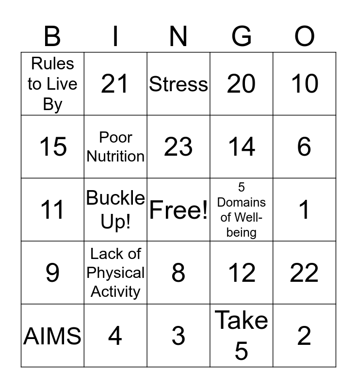 This bingo card has a free space and 29 words: AIMS, 2° Shifts, Buckle Up!, Water, Rules to Live By, Stress, Poor Nutrition, Lack of Physical Activity, 5 Domains of Well-being, 4, 1, 2, 3, Take 5, 6, 7, 8, 9, 10, 11, 12, 13, 14, 15, 20, 21, 22, 23 and 24.