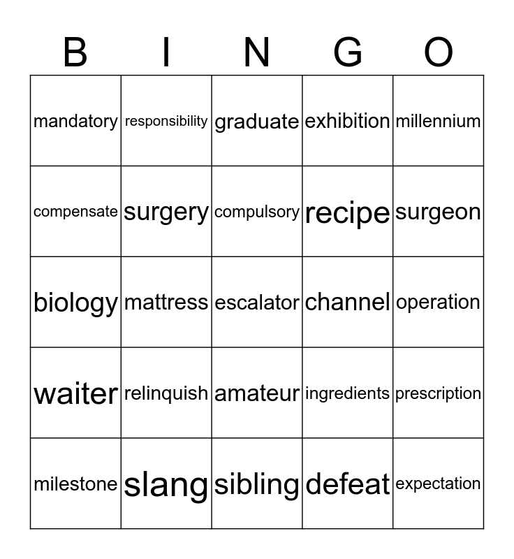 This bingo card has 25 words: relinquish, sibling, compulsory, milestone, millennium, mandatory, compensate, responsibility, channel, amateur, recipe, biology, ingredients, prescription, surgery, expectation, operation, graduate, surgeon, mattress, escalator, slang, waiter, exhibition and defeat.