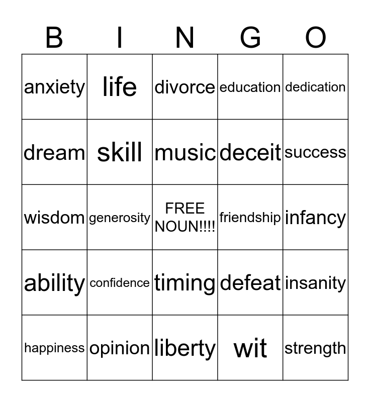 This bingo card has a free space and 29 words: happiness, love, generosity, charity, anxiety, divorce, skill, confidence, friendship, opinion, infancy, strength, liberty, wit, success, curiosity, timing, ability, dedication, wisdom, defeat, maturity, deceit, dream, education, life, insanity, music and peace.