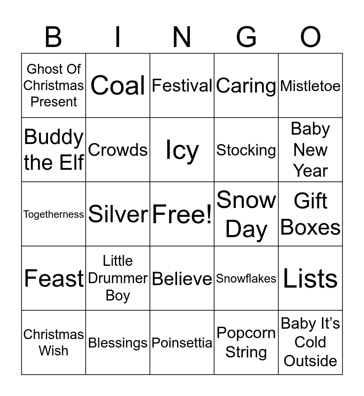 This bingo card has a free space and 79 words: Red, Happy, Festival, Naughty, Holiday BINGO, Jingle All The Way, Donner, Holly, Greetings, Ham, Trimmings, Fireplace, Caring, Ghost Of Christmas Present, We Wish You A Merry Christmas, Buddy the Elf, Entertainment, Little Drummer Boy, Receive, Gift Boxes, Wonderful Christmas Time, Mistletoe, Togetherness, Icy, Crowds, Prancer, This Christmas, Heat Miser, St. Nick, Grinch, Baby New Year, Office Holiday Party, Poinsettia, Hugs, Christmas Wish, Snow Day, The Wet Bandits, Chimney, December, Baby It’s Cold Outside, Boxing Day, A Holly Jolly Christmas, Pie, Ghost Of Christmas Past, Nutmeg, Coal, A Christmas Story, Gingerbread House, Sharing, Hope, Lists, Silver, Snowflakes, Frost, Bows, Trips, O Holy Night, Last Christmas, The Holiday, Believe, Stocking, Gifts, Star, Nativity, Carolers, Ornament, Kisses, Santa’s Sleigh, Toboggan, Feast, Blessings, I’ll Be Home For Christmas, Exchange, Let It Snow Let It Snow, Christmas Eve, Popcorn String, Chestnuts, Volunteers and Rudolph.