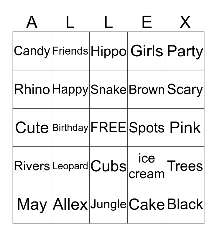 This bingo card has a free space and 24 words: Leopard, Allex, Snake, May, Party, Candy, Rhino, Friends, Spots, Cubs, Brown, Cute, ice cream, Trees, Happy, Cake, Pink, Hippo, Scary, Birthday, Black, Rivers, Girls and Jungle.