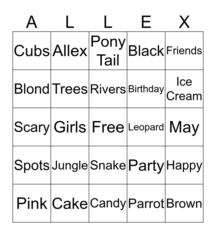 This bingo card has a free space and 24 words: Jungle, Cake, Rivers, Pink, Friends, Cubs, Blond, Allex, Leopard, Snake, Birthday, Scary, Party, Happy, Trees, Parrot, May, Pony Tail, Ice Cream, Girls, Brown, Spots, Black and Candy.