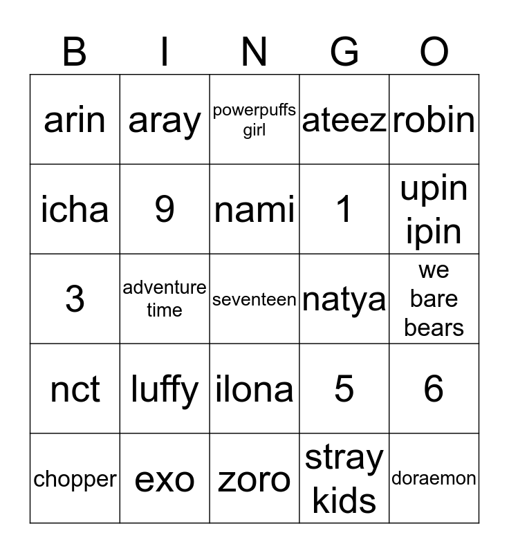 This bingo card has 25 words: luffy, zoro, nami, chopper, robin, arin, icha, aray, natya, ilona, 1, 3, 5, 6, 9, doraemon, we bare bears, powerpuffs girl, upin ipin, adventure time, seventeen, exo, nct, ateez and stray kids.