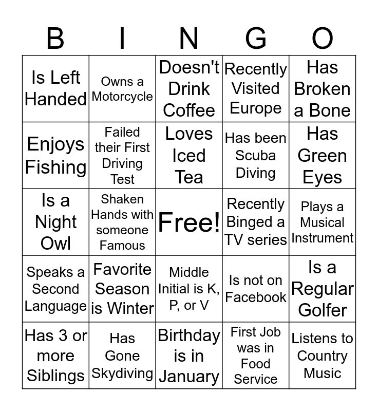 This bingo card has a free space and 24 words: Favorite Season is Winter, Has Gone Skydiving, Loves Iced Tea, Has 3 or more Siblings, Has Broken a Bone, Is Left Handed, Enjoys Fishing, Owns a Motorcycle, Recently Binged a TV series, Middle Initial is K, P, or V, Has been Scuba Diving, Is a Night Owl, Is not on Facebook, Is a Regular Golfer, Failed their First Driving Test, First Job was in Food Service, Plays a Musical Instrument, Doesn't Drink Coffee, Has Green Eyes, Shaken Hands with someone Famous, Listens to Country Music, Speaks a Second Language, Recently Visited Europe and Birthday is in January.