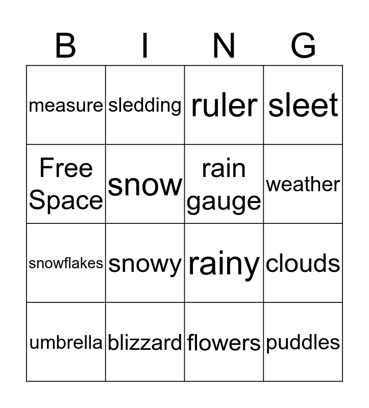 This bingo card has 16 words: blizzard, clouds, ruler, measure, snowflakes, sledding, rainy, flowers, Free Space, snow, umbrella, sleet, snowy, weather, rain gauge and puddles.