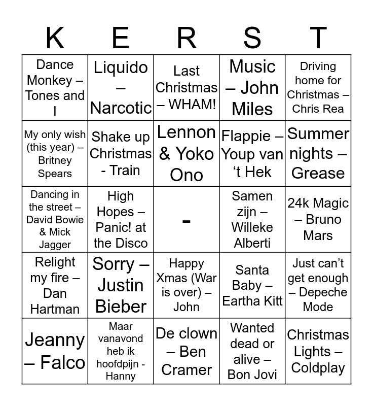 This bingo card has a free space and 40 words: Kerstmis – Marco Borsato, Dancing in the street – David Bowie & Mick Jagger, Why couldn’t it be Christmas everyday – Bianca Ryan, Shake up Christmas - Train, Maar vanavond heb ik hoofdpijn - Hanny, Happy Xmas (War is over) – John, Lennon & Yoko Ono, De bom – Frans Bauer, Driving home for Christmas – Chris Rea, Relight my fire – Dan Hartman, High Hopes – Panic! at the Disco, Music – John Miles, Christmas Lights – Coldplay, 24k Magic – Bruno Mars, Samen zijn – Willeke Alberti, Sorry – Justin Bieber, It’s the most wonderful time of the year – Andy Williams, Dance Monkey – Tones and I, In the air tonight – Phil Collins, Last Christmas – WHAM!, Just can’t get enough – Depeche Mode, Wanted dead or alive – Bon Jovi, Flappie – Youp van ‘t Hek, My only wish (this year) – Britney Spears, Do you hear what I hear – Whitney Houston, Come on Eileen – Dexy’s Midnight Runners, If you don’t know me by know – Simply Red, Waterloo – Abba, Christmas on the dance floor – Gerard Joling, Love is a battlefield – Pat Benatar, ‘t Kleine café aan de haven – Vader Abraham, Jeanny – Falco, You’re the voice – John Farnham, Santa Baby – Eartha Kitt, Summer nights – Grease, De clown – Ben Cramer, Jingle bell Rock – Mean girls (& Menno), Don’t stop (wiggle, wiggle) – The outhere brothers, Liquido – Narcotic and Pizza Calzone – Enge Buren.